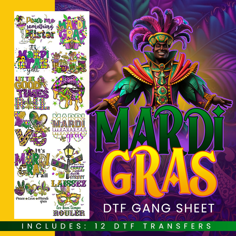 Introducing our Mardi Gras DTF Transfer Gang Sheet! This unique gang sheet features 12 distinct DTF transfers. Choose the size you like from our handy sizing chart below.