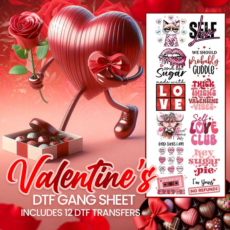 Introducing our Valentine's DTF Transfer Gang Sheet! This unique gang sheet features 12 distinct DTF transfers. Choose the size you like from our handy sizing chart below.